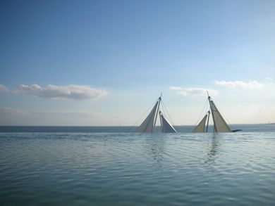 手前は人工池。船の向こう、水平線をつくっているのが実際の海。