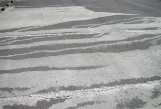 歩道中央の点字ブロックに沿ってアスファルトが裂けています。