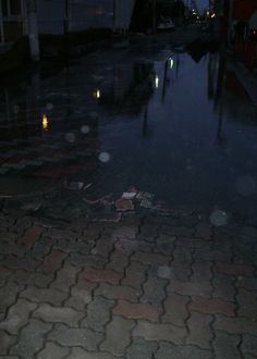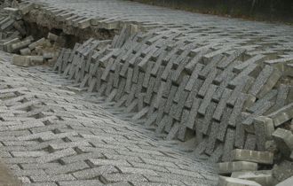 残酷な整然:敷石の道の半分が陥没。堤防の道で。