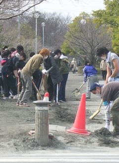 液状化現象で噴きだした泥と格闘! 砂ぼこりのまうなかの